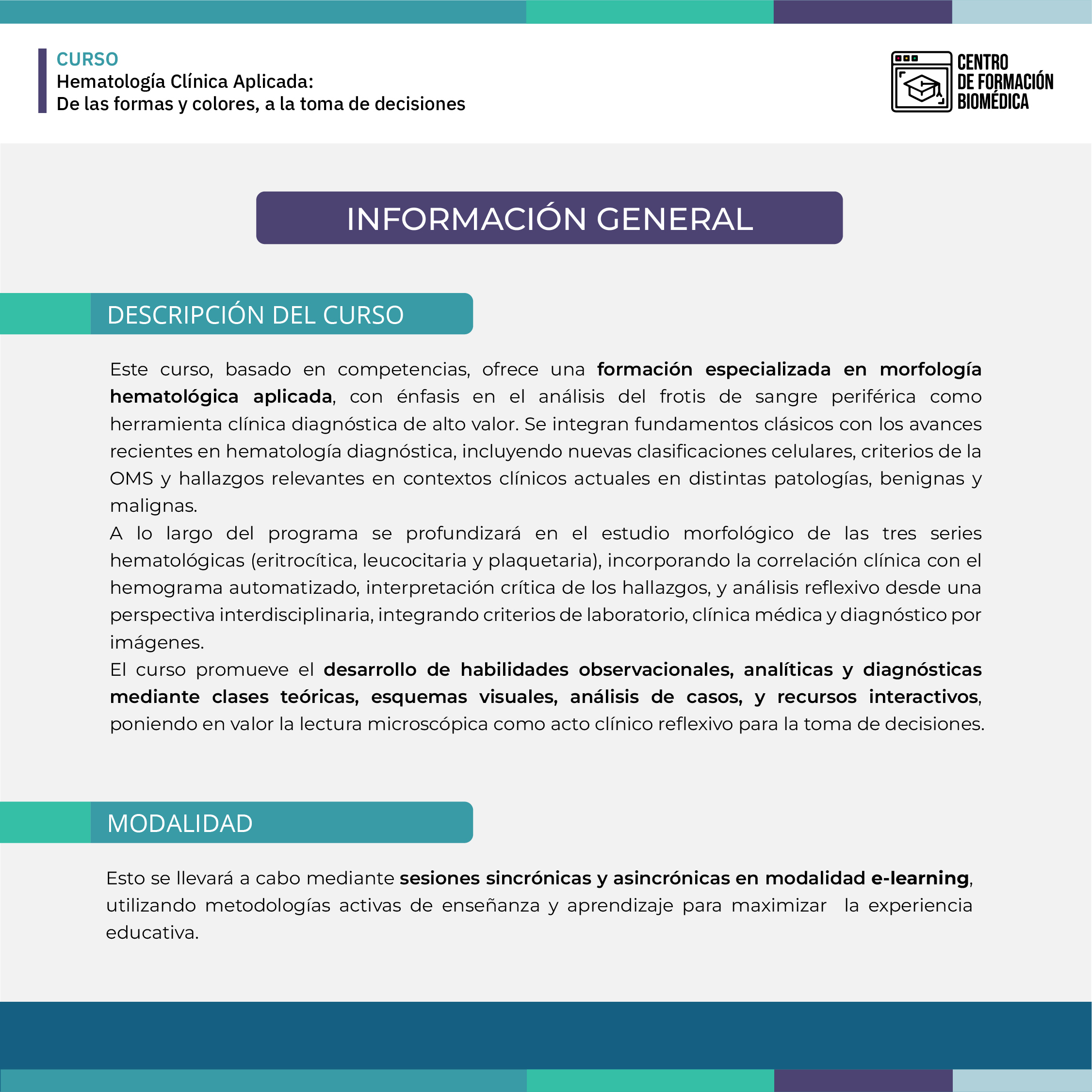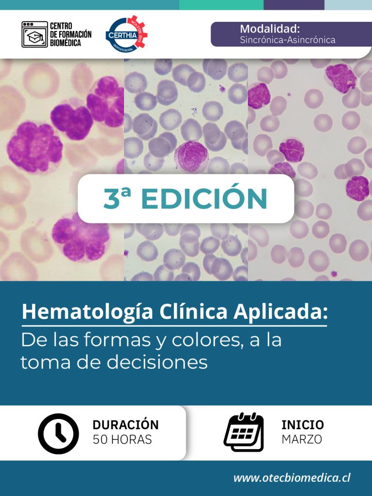 El curso «Hematología Clínica Aplicada: De las formas y colores, a la toma de decisiones», en modalidad e-learning, está dirigido a profesionales del área de la salud que buscan perfeccionar sus conocimientos en morfología hematológica, análisis de frotis de sangre periférica e interpretación del hemograma. A través de clases sincrónicas y asincrónicas, talleres prácticos, análisis de casos clínicos y evaluación, los participantes desarrollarán herramientas clínicas y técnicas aplicadas al diagnóstico hematológico. Al finalizar, estarán preparados para abordar y resolver casos con un enfoque reflexivo, integrando calidad analítica y criterio clínico.