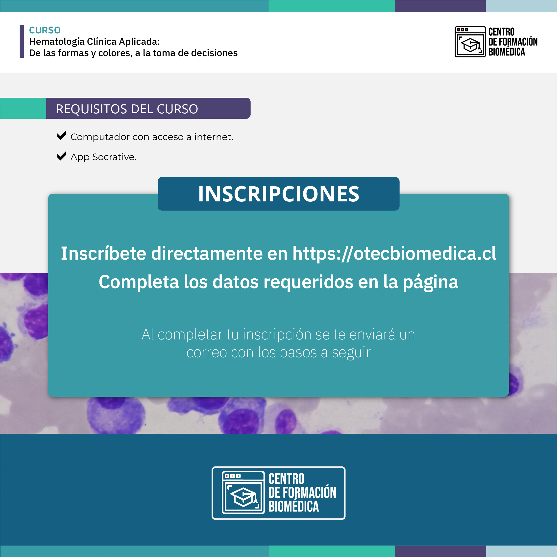Este curso está dirigido a Tecnólogos Médicos, Médicos y profesionales del área de la salud que se desempeñan o se están formando en contextos clínicos y/o de laboratorio, y que desean actualizar sus conocimientos en hematología morfológica aplicada al diagnóstico.